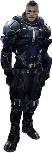 James Vega was first unveiled as "James Sanders" in Issue 217 of Game Informer, published in May 2011.[1] The basic concept behind the character is a blue collar military officer who happens to be "a heavily muscled tank of a man"; his armor is given a lot of heft to imply that he is "an unstoppable force". His rugged look with tattoos, scars and a goatee help distinguish him from the clean-cut Alliance characters.[2] He is meant to represent the perspective of a new player to the Mass Effect series.[1] James is described as a capable soldier, though "unacclimated to the delicate and often deadly inner-workings of galactic politics".[1] To celebrate his Twitter account reaching its 10,000th follower in July 2011, Executive Producer of the Mass Effect series Casey Hudson directed fans to the official Mass Effect 3 Twitter account where a promotional image of James, who by then was redesigned and renamed, had been uploaded and published.[3] Hudson explained that the Sanders name was used while the character was still in the process of being designed by his team.[4] Preston Watamaniuk, lead designer of the Mass Effect series, suggested that James is concepted as a "defensive soldier who focuses on survivability rather than fire power" in combat situations.[4]