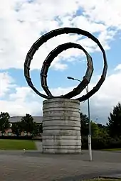 A memorial sculpture was erected for Whale in September 2001 on the grounds of a new multiplex cinema in his home town of Dudley. The sculpture, by Charles Hadcock, depicts a roll of film with the face of Frankenstein's monster engraved into the frames, and the names of his most famous films etched into a cast concrete base in the shape of film canisters. Other sculptures related to Whale's cinema career were planned, referencing his early work in a local sheet metal factory, but none had been installed as of 2019.[119]