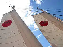 The rig on Wharrams since the early 1980s is the 'Wharram Wingsail Rig',[12] an appropriate tech squareheaded rig with low turbulence pocket round the mast and a short adjustable gaff at the head. The advantages of this rig are simplicity, low turbulence and the fact that it can be lowered in a following wind at any time. The Centre of effort on all Wharram rigs is kept low, giving them very good stability. No full-size Wharram has been known to have capsized.[13]