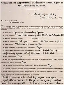 Jones was appointed as the first African-American special agent on November 19, 1919, by Bureau of Investigation director A. Bruce Bielaski. Jones was assigned to a new section of the Justice Department created to track the activities of groups perceived as subversive. His work there was under the direct supervision of J. Edgar Hoover.