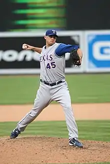 On January 25, 2007, the Texas Rangers signed Wright to a minor-league contract with an invitation to spring training. He competed with Kameron Loe and Bruce Chen for a spot in the starting rotation.[35][36] Winning the fifth spot, Wright made one short start for the Rangers on April 10 before being placed on the 15-day disabled list with right shoulder inflammation.[4][37] After four rehab starts, he was activated on June 15. "My arm strength is good. I'm ready to go and to get back out there," he said.[4][38] He rejoined the rotation upon being activated on June 15, posting a 3–4 record and a 4.57 ERA through August 3.[4][37] Long opposed to pitching exclusively in relief, Wright reluctantly moved to the bullpen during the 2007 season, starting just one game for the rest of the season.[2][1][37] The transition would be permanent for him this time, as he would start just two more games for the rest of his career.[4] In 20 games (nine starts), he had a 4–5 record and a 3.62 ERA, his finest to that point.[4]