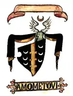In the Korjenić-Neorić Armorial (1595), signed as Yamometovich, their coat of arms had a shield with black color, party per pale by a golden pale with three pieces on each side. In each part were three upward silver crescent Moons placed on the top of each other. On the helmet was a crowned black Triton who with the bow is shooting a golden arrow. The helmet's mantle is black-golden.[1] It was again included in the Fojnica Armorial (17th century), but instead of a Triton, the helmet has a pair of white wings in the middle of which is a golden crescent Moon.[4] The Sarak armorial (1746), signed as Xamometoevich,[4] and Bojničić's Siebmachers Wappenbuch: Der Adel von Kroatien und Slavonien (1899), had the same style of the coat of arms like in Korjenić-Neorić armorial.[5]