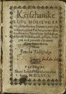 Tulščak also prepared the first Slovene prayer book, Kerſzhanske leipe molitve (Beautiful Christian Prayers), which was printed in 1579 at Johann Manlius's press in Ljubljana. It contains prayers translated from Latin and German, to which Tulščak added a long polemic sermon on proper prayer.[1][4]