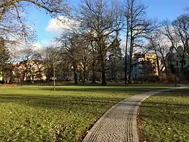 The park has been designed by Konrad Neumann, then director of the Municipal gardens of Bromberg in 1901; its initial surface was 2.8 hectares (28,000 m2). It was part of urban plans laid out in 1903, and developed through 1911[1] The design was inspired from English gardens, with about 80 species of trees and ornamental trees, mainly endemical native species.[2] The main entrance was located at Bismark Platz, today at the junction between Słowackiego and January 20, 1920 streets. The northern edge on Bulöw Straße (Adam Mickiewicz Alley) was a lawn planted with roses and low shrubs.[3]