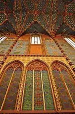 In addition to the history paintings Matejko was a prolific portraitist.[30] His subjects included Jagiellonian University rectors Józef Szujski and Stanisław Tarnowski, and numerous portraits of family and friends, including Wife in her wedding dress ("Żona w sukni ślubnej") (1865, destroyed by his wife during a quarrel and recreated in 1879) and a self-portrait (1892).[30] Altogether Matejko authored 320 oil paintings and several thousand drawings and watercolours.[35] He also designed the monumental polychrome murals for the Brick Gothic St. Mary's Basilica, Kraków (1889–1891), which in 1978 became a UNESCO World Heritage Site alongside the Historic Centre of Kraków.[36][8]