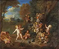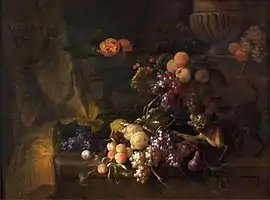 His work developed away from the style of his father towards a more decorative style, a trend common in Flemish still life painting in the final decades of the 17th century.[9] Under the influence of the French Classical movement the dramatic realism of the early Baroque was replaced by an idealised, decorative vision of nature and reality. These compositions sought to evoke an Arcadian vision of an unspoiled and harmonious nature, uncorrupted by civilization.[7] Typical for his work is the gold-colored lighting of the colors as well as the detailed reproduction of the different fruit varieties.[10]