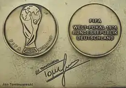 Tomaszewski is best remembered by some for his performance for the Poland national team against England, in a qualifying match for the 1974 World Cup, which England needed to win.[4] Tomaszewski had been labelled "a clown" by Brian Clough before the match (the two men however became quite friendly in later years), but had the last laugh as he turned in a man-of-the-match performance repeatedly denying England's attackers; the only goal he conceded being an equalizing penalty from Allan Clarke.[5] Earlier, Jan Domarski had scored for the Poles. Poland drew the game 1–1 and qualified for the finals in West Germany at the expense of England.[6]