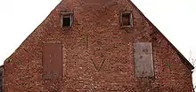 The truly principal feature of this gable, however, are die initials "T" and "I V H" worked in the masonry in black clinker brick headers. These are the monograms of the first occupants of the house, Jan van Hoesen (1687–1745) and his wife Tanneke. The "T" stands for Tanneke, given name of the wife of Jan Van Hoesen, Tanneke Wittbeck. The letters "V" and "H" stand for Jan's family name Van Hoesen. Jan's given name is represented by the letter "I", which is the Dutch representation of the letter "J".[2]