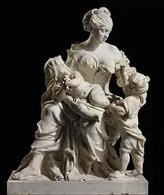 Van Delen collaborated from about 1673 to 1678 on the decorative project for the funerary chapel of Duke Lamoral of Thorn and Taxis (in the Our Blessed Lady of Zavel Church in Brussels). This decorative project was initially under the direction of his father-in-law Faydherbe. He created two allegorical figures representing Charity (Caritas) and Truth (Veritas), which were placed in niches in the chapel with two other allegorical sculptures of Hope and Faith executed by Gabriël Grupello.[6] The Charity and Faith (Fides) sculptures were stolen at the end of the 18th century during one of the occupations of the Southern Netherlands by the French. Charity was rediscovered in a French private collection two centuries later and returned to Belgium after a sale at Christie's in 2012.[8] The statue group shows charity personified by a seated young woman who has one putto on her lap and is looking at another putto who stands in front of her while raising an arm. The figures are united through there movements and express the selflessness of motherly love. The partially uncovered breast of the woman refers to the gift of the mother milk, the source of life for the next generation. The representation closely resembles the religious representations of the Virgo lactans in which the Virgin Mary is shown breastfeeding the infant Jesus. The bunch of grapes in the hands of one of the putti symbolizes the blood of Christ, which according to the Catholic faith was shed to save humanity from sin. The statue group of Truth (Veritas) by van Delen is placed in the niche of the lost statue group of Faith (Fides).[6]