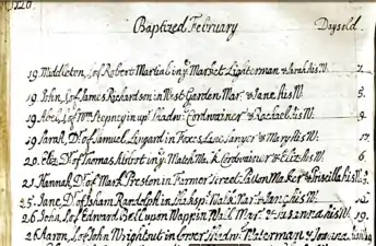 - Baptism record[5] showing she was baptised at St Paul's, Shadwell on February 25, 1720, aged 15 days, the daughter of Isham Randolph of Shakspear Walk, mariner and Jane, his wife.