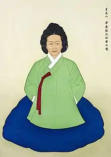 After Jang married, the couple first lived in the seaport town of Yeonghae. Later, they built a house in a mountain village in North Gyeongsang Province named Seokgye, famous for being the home town of the novelist Yi Mun-yol.[6] She raised her own seven children, as well as the two children from her husband's first marriage. During the Second Manchu invasion of Korea in 1636, she opened her home to assist those who were suffering from deprivations during the war.[3][6] She also planted an orchard of acorn trees so that the poor would always have a source of food.[6]