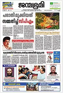 Janmabhumi is an Indian Malayalam-language daily newspaper, owned by Mathruka Pracharanalayam Ltd. and headquartered in Kochi, Kerala. It was launched as an evening paper from Kozhikode on 28 April 1977.[3] From 14 November 1977 onwards it was upgraded to a daily newspaper publishing from Ernakulam. Currently Janmabhumi has nine editions.[4] The newspaper is politically aligned with the Bharatiya Janata Party.[1][2]