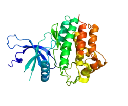 JAK1 is a human tyrosine kinase protein essential for signaling for certain type I and type II cytokines. It interacts with the common gamma chain (γc) of type I cytokine receptors, to elicit signals from the IL-2 receptor family (e.g. IL-2R, IL-7R, IL-9R and IL-15R), the IL-4 receptor family (e.g. IL-4R and IL-13R), the gp130 receptor family (e.g. IL-6R, IL-11R, LIF-R, OSM-R, cardiotrophin-1 receptor (CT-1R), ciliary neurotrophic factor receptor (CNTF-R), neurotrophin-1 receptor (NNT-1R) and Leptin-R). It is also important for transducing a signal by type I (IFN-α/β) and type II (IFN-γ) interferons, and members of the IL-10 family via type II cytokine receptors.[5] Jak1 plays a critical role in initiating responses to multiple major cytokine receptor families. Loss of Jak1 is lethal in neonatal mice, possibly due to difficulties suckling.[6] Expression of JAK1 in cancer cells enables individual cells to contract, potentially allowing them to escape their tumor and metastasize to other parts of the body.[7]