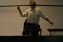 Later on performance art has become the main focus of Janusz Bałdyga’s artistic activity. Over many years of practice, he has developed a unique style, characterized by the downsizing of the language and means of articulation by using simple elements to create elementary structures.[2] He says "Performance art, often combined with object, drawing or elements of installation art, constitutes the core of my artistic practice. Writing about performance art, I highlight its fundamental, yet often ignored, educational aspect. Performance is an open discipline, constantly revealing the process of its own creation, facing artists with strongly articulated self-education tasks."[6]
