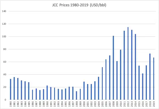 The JCC has had continuous price fluctuations over its history, whilst still steadily increasing. From the raw data and graph, the two major spikes in prices can be seen in 2008 and 2011–12. A comparatively dramatic price low can be observed in 2016.[14]