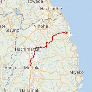 National Route 281 crosses Iwate Prefecture in a southwest–northeast routing. Beginning at a junction with national routes 4 and 282 in the prefecture's capital city, Morioka, it travels north alongside the two routes out of Morioka. In the city of Takizawa, National Route 282 leaves the concurrency near Takizawa Interchange on the Tōhoku Expressway. The concurrency of national routes 4 and 281 continues northeast, briefly crossing back in to Morioka, before entering the town of Iwate. In Iwate, National Route 281 leaves National Route 4, traveling east across the Kitakami Mountains towards the coastal city of Kuji. In the mountains, it passes through the town of Kuzumaki where it briefly has a concurrency with National Route 340. Upon crossing over the crest of the mountains, the highway enters Kuji. From there, it follows the Kuji River down to the central district of the city. After passing through the central part of Kuji, the highway terminates at a junction with National Route 45. It has a total length of 111 kilometers (69 mi),[1] though only 76.4 kilometers (47.5 mi) of that total distance is routed independently from National Route 4.[2]