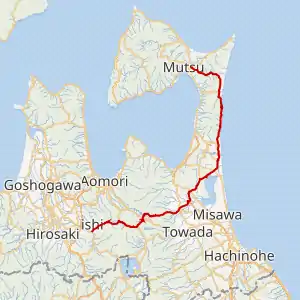 | Mutsu | Northern terminus; northern end of unsigned National Route 338 concurrency | ||||||