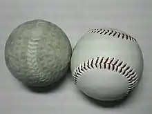 Japanese-style baseball, or rubber-ball baseball, (Japanese: 軟式野球, romanized: Nanshiki yakyū, lit. 'soft baseball') is a game that was created in Japan and is derived from baseball. It uses a hard rubber ball instead of a regular baseball made of leather. It has been rendered in English in a variety of ways, including nankyu baseball (nankyu means 'soft ball' in Japanese), nanshiki baseball and rubber baseball. In a narrow sense, Japanese-style baseball is a game that uses a hollow rubber ball, and in a broad sense, it includes a semi-hard baseball where a hard ball's outer coating is replaced with rubber. In contrast, the ball used in softball is most often leather but is larger than a regular baseball.