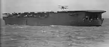Hōshō was laid down by the Asano Shipbuilding Company in Tsurumi-ku, Yokohama, on 16 December 1920. She was launched on 13 November 1921 and towed to Yokosuka Naval Arsenal for completion on 10 January 1922. Hōshō was delayed by repeated design changes and late deliveries of equipment, pushing the commissioning date from March to 27 December 1922. She was commissioned lacking much of her aviation equipment, and did not begin landing trials until 22 February 1923.[19] The first landings were made by British pilots under contract, who were quickly replaced by Japanese pilots trained by the British Aviation Mission.[20] After Hōshō was commissioned, experienced aircrews requested changes, and the ship was modified by the shipyard from 6 June to 20 August 1924. The island, tripod mast, and aircraft crane were removed since they partially obstructed the flight deck and obscured pilot visibility. The forward part of the flight deck was made horizontal, and the 8 cm AA guns were moved forward, close to the position of the former island and out of the way of landing operations.[21] Another reason for removal of the island was that the IJN found that it was too small and cramped to be of effective use in controlling air operations or conning the ship.[3] After the island was removed, the carrier's flight operations were controlled from a platform extending from the side of the flight deck, a design that would be repeated in subsequent Japanese aircraft carriers.[22] The ship was then assigned to the 1st Fleet until 15 November 1924.[21]