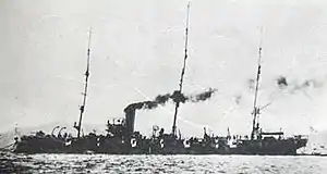 During the Siege of Tsingtao in World War I, Chiyoda was part of the Japanese fleet sent to capture the Imperial German Navy base at Tsingtao in Shandong, China.[5] Afterwards, based out of Manila, she took part in Allied patrols of the China coast against German commerce raiders.