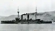 The ship participated in the early stages of the Battle of Tsingtao before returning to Sasebo on 2 October 1914.[36] The following month, Tokiwa was deployed to Singapore preparatory to searching for the German commerce raider Emden, but the German ship was sunk before the mission began.[37] The cruiser was assigned to the Training Squadron on 1 September 1916 preparatory to her departure on 5 April 1917 with Yakumo on a training cruise to ports in California, Hawaii and the South Sea Islands with cadets from the 44th class of the Imperial Japanese Naval Academy. After her return on 17 August, the ship was relieved of her assignment to the Training Squadron on 25 August[38] and sent to Honolulu, Hawaii in October to protect shipping from any German commerce raiders and to allow the US Navy to redeploy its forces to the Atlantic.[39]