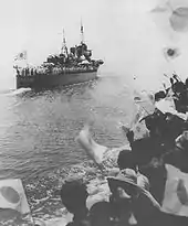 Hamakaze was heavily involved in the fighting in 1943 in the Solomon Islands chain, including the battles of Kula Gulf, Kolombangara, and the 'Battle off Horaniu'. On 7 April 1945, Hamakaze escorted the battleship Yamato from the Inland Sea on her Operation Ten-Go attack on the Allied forces on Okinawa. She was sunk by aircraft of Task Force 58 and sank 150 miles (240 km) southwest of Nagasaki (30°47′N 128°08′E).[4]