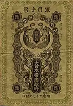 Japanese military currency (日本軍用手票) is the name given to money used by the Japanese armed forces for the purchase of supplies in occupied territories.[1] It was mainly issued in denominations of yen, and subsidiary currency of sen with the exception of the first Sino-Japanese War series. This particular article covers pre-Shōwa era currency issued from 1894 to 1918 in three different periods. During this time Japan was militarily involved in the First Sino-Japanese War, Russo-Japanese War, and events during World War I such as the Siberian intervention. The military currency issued during these events circulated in Japanese Korea, the Republic of China (Manchuria), and the Russian State. All of the notes issued share a similar design which resembles government issued civilian currency which circulated in Japan from 1872 to 1899. Japanese military currency was exchangeable at the given time for both silver and gold bullion. Most of these events were not long term which impacted the amount of surviving currency in different ways. It was also routine after each event for officials to exchange the military currency issued for bullion or other forms of payment such as banknotes. Unredeemed notes were thus either held by the public as commemorates or eventually lost in the decades that followed. Those that remain today are collected and traded depending on the condition and surviving rate of the series. The lower demonization notes are easier overall to obtain than those valued above one yen.