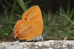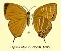 Z. lutea Hew. (74 f). The outer margin of the wings strongly rounded. particularly in the female; hind wing with a long tail. Honey-yellow, the forewing with a broad black distal border. Underside with a white submarginal line, which separates the disc from the orange-red distal margin; on the disc white- edged bands, a short similar hand on the cross-veins of the forewing. In Amurland and Japan. — Larva on Quercus mongolica, very frequently infested with the larvae of Diptera. The butterflies occur in August on wide roads in forests of high trees and also in bush-woods; they are rather plentiful in many places. The Continental specimens do not differ from Japanese ones; the black border of the forewing varies rather strongly in width among the individuals from the same locality.[2]