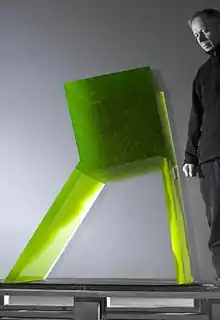 Much of Libenský and Brychtová's architectural work was done for buildings in Czechoslovakia, including two windows, created for the St. Wenceslas Chapel in Prague's St. Vitus Cathedral. Built in the fourteenth century, the historic chapel was reconstructed by the Czech government between 1961 and 1964. Libenský and Brychtová were selected by competition to replace the chapel's original stained glass windows, which dated from 1912 to 1913. The artists created an abstract design for the windows that, in its modern simplicity, departed from the ornate, early sixteenth-century decoration of the chapel. To relate the new to the old, Libenský and Brychtová used the muted grey-brown, grey-green and pink hues in the chapel's frescoes as the predominant colors in their windows.[12] Outside of Czechoslovakia their architectural glass work was seen in World's Fair exhibitions and Czech Embassies.[8] At Expo '67 in Montreal, Canada, they created three large sculptures for the Czechoslovakian Pavilion's "Hall of Century and Traditions". These were "Blue Concretion", "Sun of the Century", and "Large Conus".[13] According to Corning Museum of Art curator Tina Oldknow, these large-scale sculptures in glass were "a revelation" to the American Studio Glass artists who saw them, including Harvey Littleton, Dale Chihuly and Marvin Lipofsky.[14]