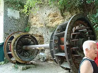 The two generators (42 Hz, 550 kW each) and the transformers were produced and installed by the Hungarian company Ganz. The transmission line from the power plant to the city of Šibenik was 11 km (6.8 mi) long on wooden towers, and the municipal distribution grid 3000V/110 V included six transformer stations.[7][8] The original Jaruga system supplied 340 street lights and some electrified houses in Šibenik.