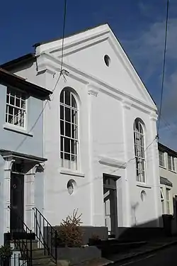 Sussex was a hotbed of Protestant Nonconformity in the 16th and 17th centuries, and Puritans were active in Steyning from 1587 or earlier.[2] Quaker and Baptist communities became established: a 17th-century timber-framed house now called Penn's House (after William Penn, who lived nearby and was associated with it)[3] was used by Quakers as a meeting house, and a short-lived Baptist chapel existed on Steyning High Street.[2] In 1835, Rev. Edward Lambert, described as a "Dissenting minister" from Brighton, visited Steyning and founded another chapel.[4] It was originally associated with the Countess of Huntingdon's Connexion,[5] a small Calvinistic Methodist denomination found mostly in Sussex, but the cause was unsuccessful. Rev. Lambert returned to Brighton, where he was later associated with Zion Chapel in the town's Bedford Street.[4] Jarvis Lane, on which the originally unnamed chapel stood, was named after its most prominent building—Jarvis House, a 15th-century timber-framed farmhouse. The land around it was part of a tenement called Gervases in 1403, and the name originated with the family of Robert Gervays, recorded in 1255.[6]