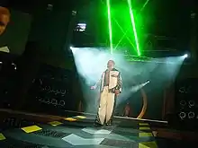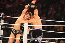 At No Way Out on February 17, Christian and Lance Storm entered a tag team turmoil match with the winners getting a WWF Tag Team Championship match at WrestleMania X8 which was won by The Acolytes Protection Agency (APA).[35] After a series of defeats, Christian announced he would quit the WWF, but Page persuaded him to reconsider and adopted him as his protégé.[3] Christian betrayed Page and faced off against him for the European Championship at WrestleMania X8 on March 17, but he lost.[3] Christian began throwing tantrums in his gimmick at the time whenever things did not go his way and during the same event defeated Mighty Molly to win the WWF Hardcore Championship, but lost the title to Maven later that night.[36] Christian formed an alliance with fellow Canadian wrestler Lance Storm on the June 20 episode of SmackDown!, complaining that the WWE[lower-alpha 1] has a history of prejudice against Canadians, bringing up the Montreal Screwjob as an example.[37] On the June 27 episode of SmackDown!, Test, another Canadian, joined their team, now called The Un-Americans.[38] Christian and Storm won the WWE Tag Team Championship at Vengeance by defeating Edge and Hollywood Hulk Hogan.[39] The trio then defected from SmackDown! to Raw, appearing on the July 29 episode of Raw to attack The Undertaker.[40] The Un-Americans teamed with Triple H, to defeat WWE Undisputed Champion The Rock, The Undertaker and Booker T and Goldust in an eight-man tag team match on the August 12 episode of Raw, after Test pinned Undertaker.[41] At SummerSlam Christian and Storm retained the WWE Tag Team Championship against Booker T and Goldust, before interfering in Test's match with the Undertaker later in the night, only to be tossed out of the ring and for Undertaker to defeat Test.[42] On the August 26 episode of Raw, the Un-Americans attempted to burn the American flag, but were stopped by Booker T, Goldust and a returning Kane.[43] On the September 2 episode of Raw, William Regal joined the team. Regal, an Englishman, was the only member of the team not of Canadian nationality.[44] At Unforgiven on September 22, The Un-Americans lost to Bubba Ray Dudley, Kane and Booker T and Goldust.[45] The Un-Americans lost the WWE Tag Team Championship the next night on Raw to the team of The Hurricane and Kane.[46] On the September 30 episode of Raw, both Christian and Storm lost matches to Randy Orton, while Regal and Test lost to Rob Van Dam and Tommy Dreamer. This led to all four members attacking each other, thus disbanding the team.[47]