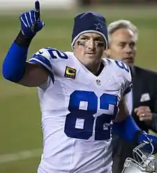 Witten had a career year in 2007, breaking his own single-season Cowboys tight end record for receptions with 96 and becoming the first franchise tight end to reach 1,000 receiving yards in a season. He became the third tight end in NFL history with 96 or more catches.[34] He started the season off strong with six receptions for 116 receiving yards and a touchdown in a 45–35 victory over the New York Giants in Week 1.[35] In the Week 9 game on November 4, while playing on the road against the Philadelphia Eagles, he made a 53-yard reception after losing his helmet.[36][37] On December 9 against the Detroit Lions in Week 14, Witten's 15 receptions tied an NFL record held by Hall of Famer Kellen Winslow Sr., for most receptions in a game by a tight end in NFL history.[38] In the following game against the Eagles in Week 15, Witten became the first Dallas tight end ever to gain over 1,000 receiving yards in a season. Witten was also one of the NFL-record 13 Cowboys players selected to the Pro Bowl.[39][40] Additionally, he made the 2007 All-Pro team along with teammates Terrell Owens and DeMarcus Ware. He was named as a First Team All-Pro for the 2007 season.[41] Witten was nominated for the 2007 Walter Payton NFL Man of the Year Award, which was won by Jason Taylor.[42]