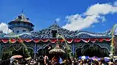 Traditional Javanese building can be identified by its trapezoid shaped roof supported by wooden pillars.[26] Another common feature in Javanese building is pendopo, a pavilion with open-side and four large pillars. The pillars and other part of the buildings can be richly carved. This architecture style can be found at kraton or palace of the Sultanates of Yogyakarta (palaces of Hamengkubuwono and Pakualaman) and Surakarta (palaces of Pakubuwono and Mangkunegaran).[27]