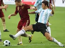 Zanetti remained a regular under new coach Diego Maradona, although defensive midfielder Javier Mascherano took over as captain at Maradona's request.[44] Despite winning the Champions League at club level, Zanetti and Inter teammate Esteban Cambiasso were not included in the Argentina squad for the 2010 World Cup. This move was heavily criticised by football pundits from both South America and Europe. Instead 30-year-old Ariel Garcé, who had been called up just twice in the previous five years,[45] received a shocking selection, but ultimately did not play a single minute in any World Cup match. Zanetti's place in the starting line up was taken by Jonás Gutiérrez, who had spent the previous season playing on the wing for Newcastle United in England's second-tier Football League Championship.[46]