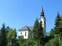 The local church is dedicated to Saint Giles (Slovene: sveti Tilen). It was originally a Gothic church with an angled apse. Around 1710 it was made taller and renovated in the baroque style. The belfry is from the 16th century. The church was again widened and extended in the 1920s. The three altars are from the late 19th century.[7] The paintings in the church are by Janez Šubic, the altar is the work of Štefan Šubic, and the Stations of the Cross are by Leopold Layer. The village chapel shrine, which contains a Gothic Pietà from 1440, was painted with frescoes by Štefan Šubic in 1861.[6]