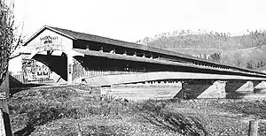 The Jay Street Bridge crosses the West Branch Susquehanna River between Lock Haven on the south bank and Lockport on the north. The original structure, completed for the Lock Haven Bridge Company by the E. Kirkbride Company in 1852, was a covered bridge about 800 feet (240 m) long.[2] A two-story toll house, 48 feet (15 m) long and 18 feet (5.5 m) wide was later added at the foot of the bridge on the Lock Haven side.[2] Travelers using the bridge passed through an archway in the center of the toll house.[2] The bridge included a covered pedestrian walkway on the downstream side.[1]