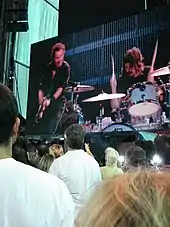 Once the initial portion of the tour began in early April 2009, Weinberg played from several songs to half the show on most of the dates.[8][12][15][16] He received a very positive reaction from both audiences and reviewers as a re-energizing "spark plug"[16] for the much-older band,[17] with his vigorous, long-hair-flying style inviting comparisons to Dave Grohl[18] and his potential for replacing his father drawing allusions to Wally Pipp.[7][15] He began playing complete shows in mid-May 2009 during the tour's American first leg, as his father went to California to prepare test runs for The Tonight Show start.[9][17] Modern Drummer magazine's editor said that a college freshman playing on one of the year's biggest rock tours is "certainly a unique story".[9] Weinberg played a number of dates early on in the European second leg of the tour, including at the Dutch Pinkpop festival in Landgraaf, Netherlands in addition to Bonnaroo in Manchester, Tennessee. He also played during a few dates of the American third and final leg. When not needed for the Springsteen tour, he continued to play for the Reveling, often before audiences that were three orders of magnitude smaller; he said of the difference, "I liked the duality of it all ... I like doing this just as much as I like doing that."[12]