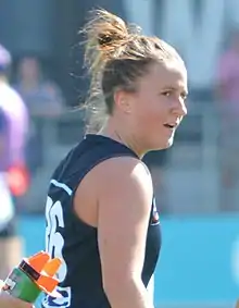 Van Dyk was drafted by Carlton with the twenty-first pick in the 2018 AFLW draft, their third selection.[3] She debuted in the opening round of the 2019 season: a loss to North Melbourne at North Hobart Oval.[5] Van Dyk appreciated leadership shown by her experienced teammates, citing Brianna Davey, Kerryn Harrington, Tayla Harris, Gabriella Pound, and Darcy Vescio as examples.[6] She played nine games in her first season, including the preliminary final and grand final.[7] It was revealed Van Dyk had signed on with the Saints for two more years on 30 June 2021, tying her to the club until the end of the 2022/2023 season.[8]