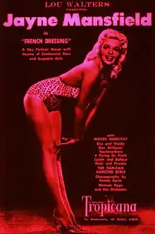 Her wardrobe for the shows at Tropicana and Dunes featured a gold mesh dress with sequins to cover her nipples and pubic region.[111][116][127] That controversial sheer dress was referred to as "Jayne Mansfield and a few sequins".[119] In early 1963, she performed in her first club engagement outside Las Vegas, at the Plantation Supper Club in Greensboro, North Carolina, earning $23,000 in a week ($204,000 in 2021 dollars), and then at Iroquois Gardens in Louisville, Kentucky.[128] She returned to Las Vegas in 1966, but her show was staged on Fremont Street, away from the Strip where the Tropicana and Dunes were.[116] Her last nightclub act French Dressing was at the Latin Quarter in New York in 1966, also repeated at the Tropicana.[126] It was a modified version of the Tropicana show, and ran for six weeks with fair success.[129]