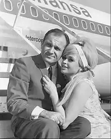 In 1967, film critic and exploitation movie expert Whitney Williams wrote of Mansfield in Variety: "her personal life out-rivaled any of the roles she played".[150] She married and divorced three times and had five children. Mansfield was allegedly intimately involved with many men, including Claude Terrail (owner of the Paris restaurant Tour d'Argent),[151] Robert F. Kennedy,[152] John F. Kennedy,[153] Brazilian billionaire Jorge Guinle,[154] her attorney Samuel S. Brody, Las Vegas entertainer Nelson Sardelli, and producer Enrico Bomba. She met John F. Kennedy through his brother-in-law Peter Lawford in Palm Springs, California, in 1960, before he had his alleged affair with Marilyn Monroe, but their alleged affair did not last.[155][156][157] Mansfield and Brody, her lawyer and alleged lover at the time, were both killed in a car crash.[158][159]