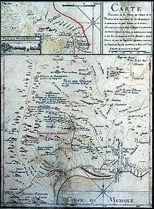 La Harpe followed the Red River upstream, probably to the vicinity of present-day Idabel, Oklahoma. He then turned north to cross the rugged east–west ridges of the Ouachita Mountains which rise more than 300 metres (980 ft) above the intervening valleys. While in the mountains, La Harpe encountered an Osage war party and narrowly avoided a fight. He also found evidence that a "Cancey" (Apache) war party was in the area.[4] On 3 September, after 23 days of traveling, La Harpe and his party reached a large settlement. Opinions differ as to its location, but after a dig at the Lasley Vore Site in 1988, University of Tulsa anthropologist George H. Odell claimed that archaeological evidence points to it being located about 13 miles (21 km) south of Tulsa, Oklahoma near the western bank of the Arkansas River.[5]