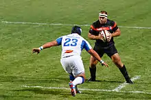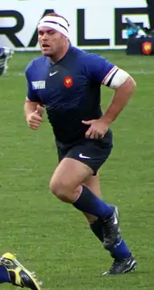 Jean-Baptiste Poux (French pronunciation: [ʒɑ̃batist puks];[1] born 26 September 1979) is a former French rugby union footballer who played as a prop, and was capable of playing loosehead and tighthead. Poux began his professional rugby career at RC Narbonne in 1998 before moving to Toulouse, where he was a part of the side that won the 2003, 2005 and 2010 Heineken Cups.[2][3][4] In 2013, Poux joined Union Bordeaux Bègles. Poux has also played for the French national team, and was included in their 2003, 2007, and 2011 Rugby World Cup squads.