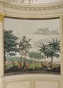Les Sauvages depicts First Nation's people from throughout the Pacific set in a fictional tropical setting. The work was inspired by the exploration voyages of Captain James Cook between 1768 and 1779 and Jean François de La Pérouse in 1785.[9] Following these expeditions, the Pacific captured the imagination of Europe and America and was the inspiration for literature, plays and images which reached a wide audience.[10] Images produced by official voyage artists like John Webber were engraved and published, inspiring other exotic Pacific depictions like the Tableau des decouvertes du Capne. Cook & de la Perouse by Jacques Grasset de Saint-Sauveur.[11] Similarities in the colour palette and figurative vignettes in Les Sauvages indicate that Saint-Sauveur's Tableau may have inspired the work.[12] Primary sources, like the wallpaper's accompanying prospectus produced by Joseph Dufour in 1806, indicate that the subject of exploration and representations of the Pacific were very popular with a nineteenth century audience.[13] The interest was encouraged by Enlightenment philosopher Jean-Jacques Rousseau’s notion of the noble savage and the Pacific as a moral utopian civilization.[14] Les Sauvages perpetuates Rousseau’s stereotype, depicting homogenized races, living in harmony and peace.[15] Les Sauvages also demonstrates another contradictory Enlightenment ideal of pride in man’s scientific innovations, indicated by the celebration of exploration. The depiction of the Pacific seen in Les Sauvages is typical of the period, celebrating progress and innovation as well as a nostalgia for an imagined utopian past.