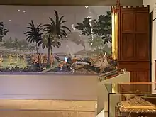 Les Sauvages de la Mer Pacifique (Les Sauvages) is a scenic panoramic wallpaper designed by Jean-Gabriel Charvet and produced by Joseph Dufour et Cie between 1804 and 1805 in Mâcon, France.[1] Les Sauvages was one of the first panoramic wallpapers ever produced, premiering at the French Industrial Exposition in 1806.[2] As such, the judge Jean-Baptiste de Nompère de Champagny noted that it was unusual in style and medium describing it as, “perhaps the most curious example of this art”.[3] It was one of the largest panoramic wallpapers produced at this time, consisting of twenty panels and measuring over ten meters in length and over two meters high.[4] Endless paper was not available on a commercial scale until 1810, therefore, the large panels were made from handmade linen rag paper which was joined at the edges.[5] A light blue water-based ground was applied to the paper before the woodblocks printed the design using vivid colour pigments like green verditer and Prussian blue.[6] Designs for each shade of colour were carved from separate blocks and printed in layers in order to achieve a detailed design and naturalistic depiction of light and shade.[7] The conservation department at the National Gallery of Australia reported that up to seven different shades were used to achieve naturalistic gradients in skin tone in order to imitate depth of form.[8]