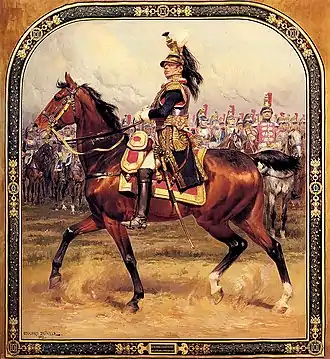 By contemporary accounts, d'Hautpoul was a big man, possibly taller than Joachim Murat, who was nearly six feet tall. Endowed with broad shoulders and a big voice. He spoke the language of the common soldier, and led from the front.[5] Early in the French Revolution, commissioners visited the various regiments to weed out dangerous, and prospectively traitorous nobles; generally, the commissioners cowed the army into submission, but d'Hautpoul's cavalry regiment refused to be intimidated. When the commissioners came for their colonel, a scion of impoverished nobility, his soldiers refused to give him up: "No d'Hautpoul, no 6th Chasseurs."[6] Thus, despite his noble birth, at the exhortations of his soldiers he remained in the French Revolutionary Army.[7]