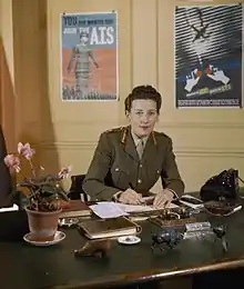 On 21 July 1941, she was appointed Director, Auxiliary Territorial Service. She was given the acting rank of chief controller (equivalent to major general), while holding the war substantive rank of senior commander (equivalent to major).[9] This made her the world's youngest general at that time.[2] One of her first actions as Director was to design a new, well fitting uniform for all ranks of the ATS.[10] On 21 July 1942, she was promoted to war substantive controller (equivalent to colonel) and made temporary chief controller.[11] She travelled to Canada in September 1942 to inspect the Canadian Women's Army Corps and assisted in its recruiting campaign.[12] She returned to the UK in November following the seven-week trip.[13] On 30 October 1943, she relinquished the appointment of Director, Auxiliary Territorial Service,[14] for health reasons.[15]
