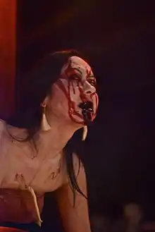 One Coven of Ashes performance, Desecrated in Death: The Path of the Unholy, marked the release of Missy Munster's fashion line Let the Devil In. The performance featured dramatic lighting in which performers crawled onto a giant spirit board, fell into a trance state and bled from their foreheads. One blindfolded performer in the middle of the circle hung from two hooks in her back. She paced back and forth around the circle and was lifted into the air as a human pendulum. Later in the performance, Lauren Davis, playing the role of shadow demon, summons the dead. Jeanelle Mastema and Carmen Carrasco, playing the dead, hung from flesh hooks. They spun in a circle like a mobile until finally resting in their coffins. A sermon was given, while Munster was brought out, bound by rope. With the assistance of Lauren, Munster cut through her restraints and proceeded to insert a spear in her face and cut her chest with a scalpel.[12][13]