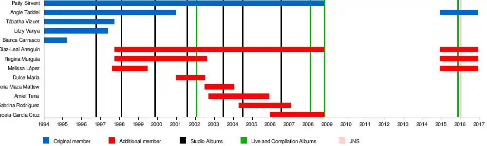 The group went through constant changes during their whole time together, even before formalizing the project when the group was created in 1995. Most of the members in the group would depart due to disagreements with manager Alejandro Sirvent (father of group member founder Patricia Sirvent) which would become source of controversy for the group and the way it was managed, with the exception of Dulce María as not only she was close with the band but the reason for her departure from the group was mostly due to landing the main role of Marcela Majía in the 2002 telenovela, Clase 406. In each of the albums the group saw a change in their line-up. During the first 12 years of the group before they reunited in 2015, a total of 13 girls became (in a more or less relevant way) part of the group.