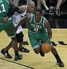 On August 22, 2012, Green signed with the Celtics to a deal rumored to be for four years and approximately $36 million.[15][16] On March 18, 2013, Green scored a career-high 43 points in a 105–103 loss to the Miami Heat.[17][18] On April 3, 2013, he scored 34 points against the Detroit Pistons.[19]